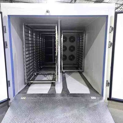 2.Проектировано для однородного обезвоживания: оснащено циркуляционной системой большого объема, питаемой банком из 6 тяжелых вентиляторов, генерирующих 3000-4500 м3/ч непрерывного воздушного потока.Аэродинамические каналы на полу вытесняют сухой воздух равномерно по всем 180 подносам одновременно, предотвращая локализацию плесени или недостаточную сушку.
