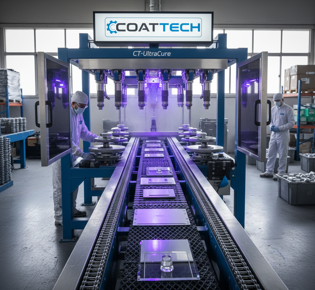 CT-UltraCure предназначена для мгновенного отверждения плоских или низкопрофильных деталей, покрытых УФ-чувствительными материалами. Детали проходят через светозащищенный туннель под высокоинтенсивными ртутными или светодиодными УФ-лампами, мгновенно отверждаясь. Это позволяет немедленно штабелировать или упаковывать детали в конце линии.