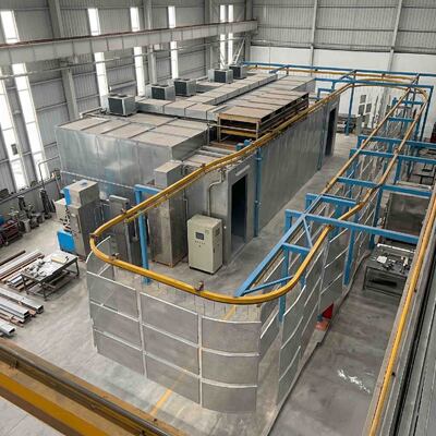 Промышленная система обработки материалов, направляющая металлические детали через чистое порошковое покрытие и производственное предприятие.